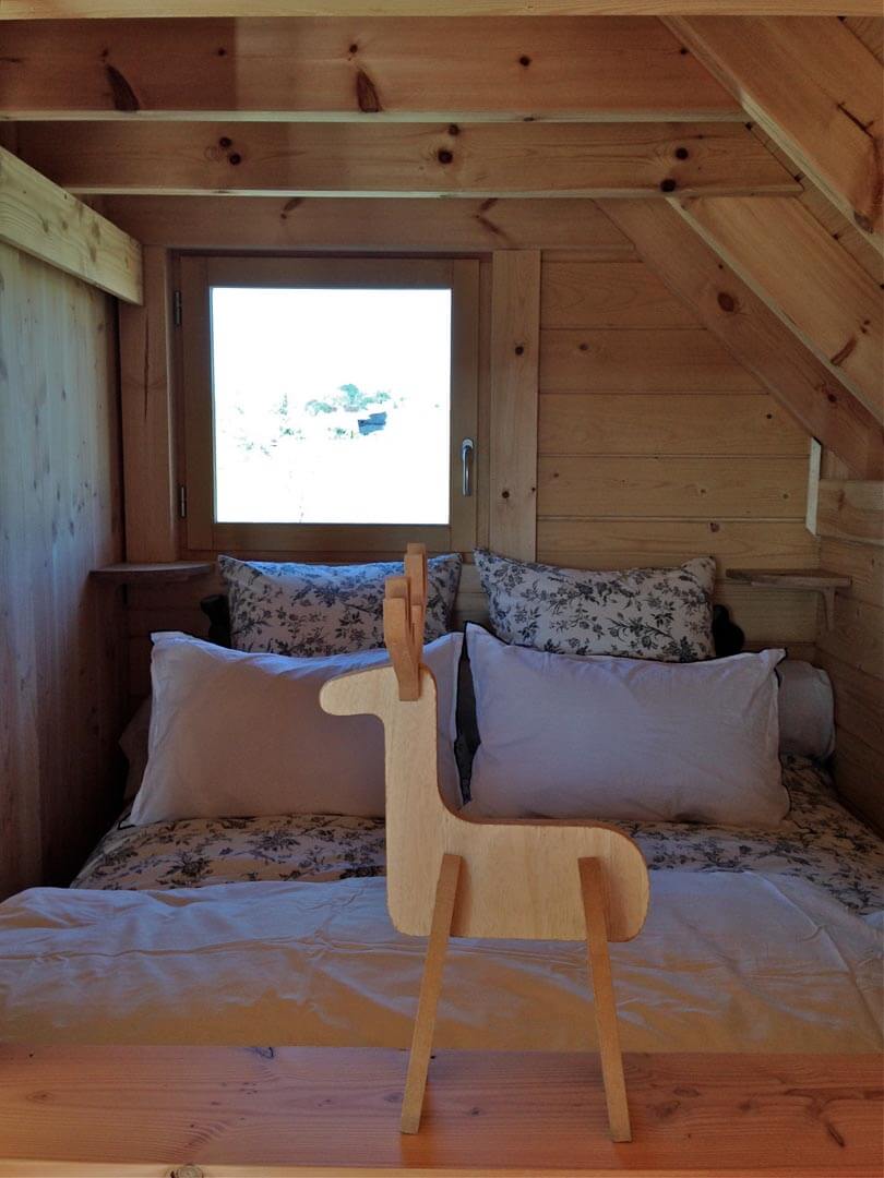 2 lits jumeaux. Les lits se situent sous les combles sous la pente du toit. L’acces se fait par une échelle en bois pour rejoindre la petite mezzanine.